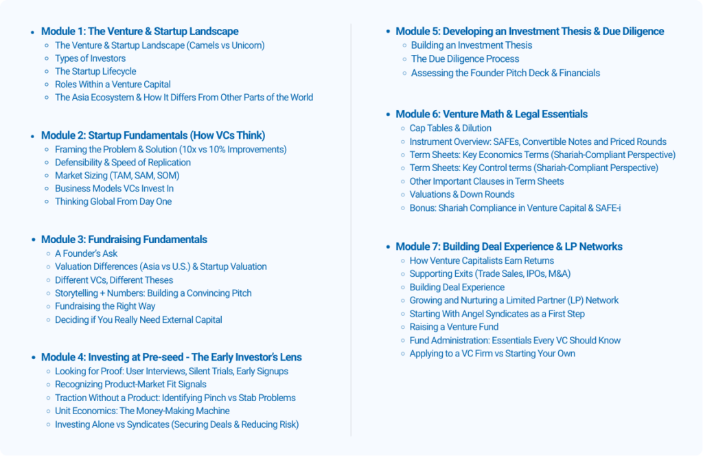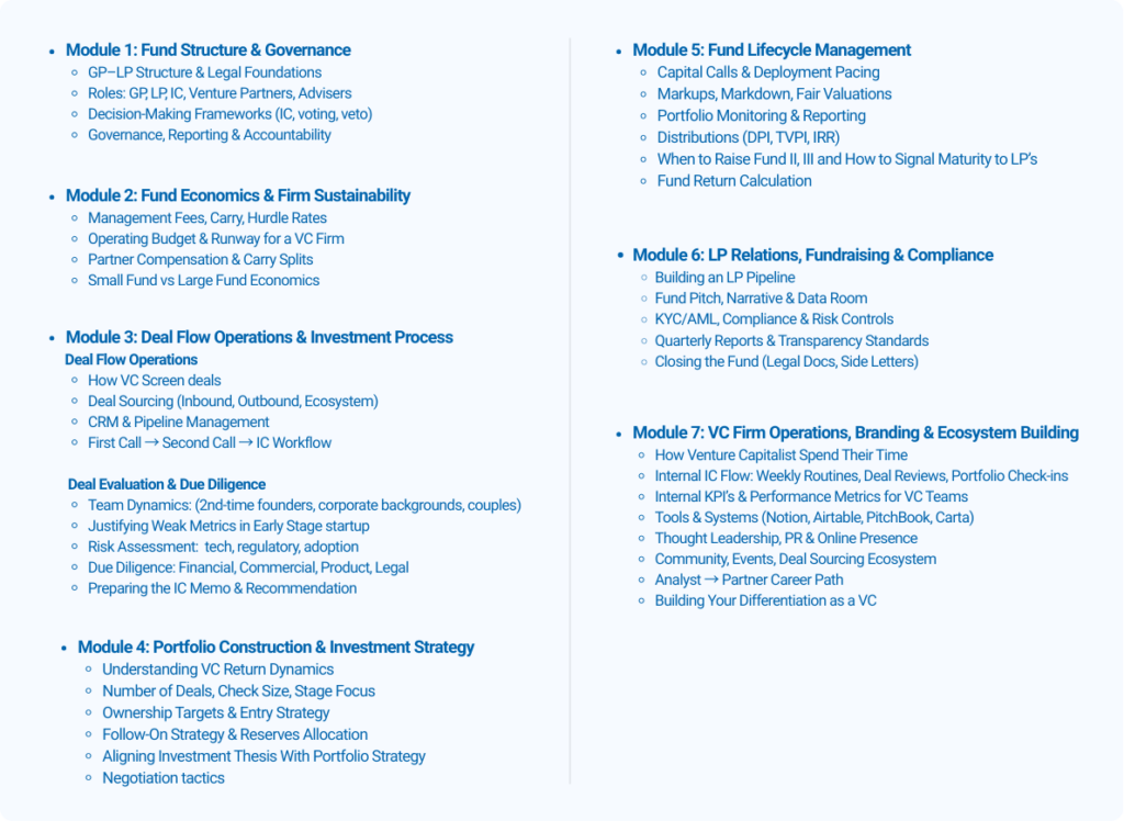 No prior experience in venture capital is required. The program is designed for motivated learners, aspiring investors, founders, operators, or professionals looking to understand how VC works at a practical level.